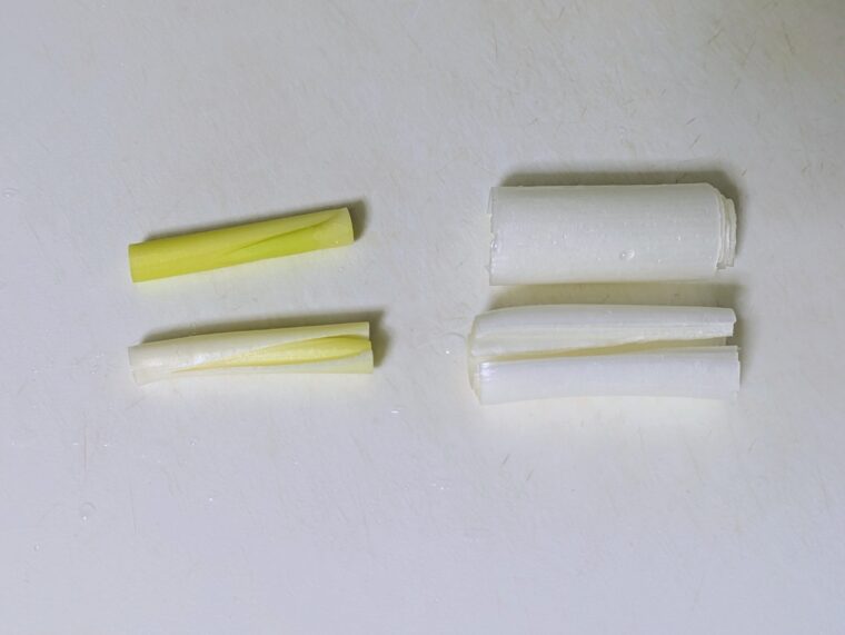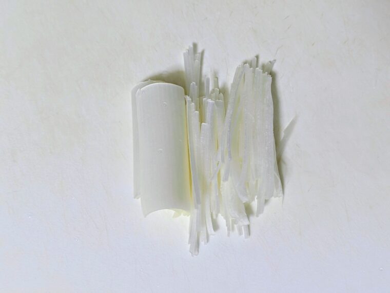 ②白い部位を縦の繊維に沿って千切りにして白髪ねぎを作り、水に漬けて辛味を抜いておきます。