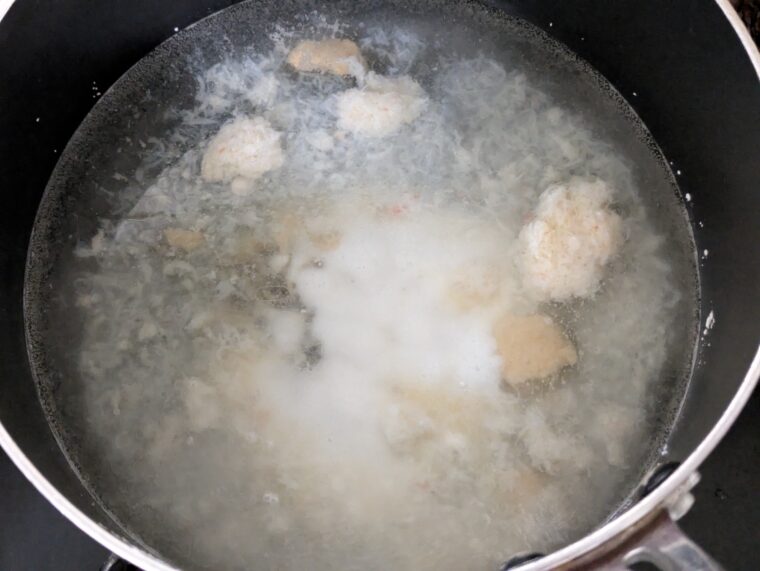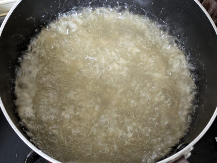 ⑤小鍋に【カニあんかけ】の調味料を全て入れて片栗粉がダマにならないように時々かき混ぜながら中火でとろみが付くまで加熱します。