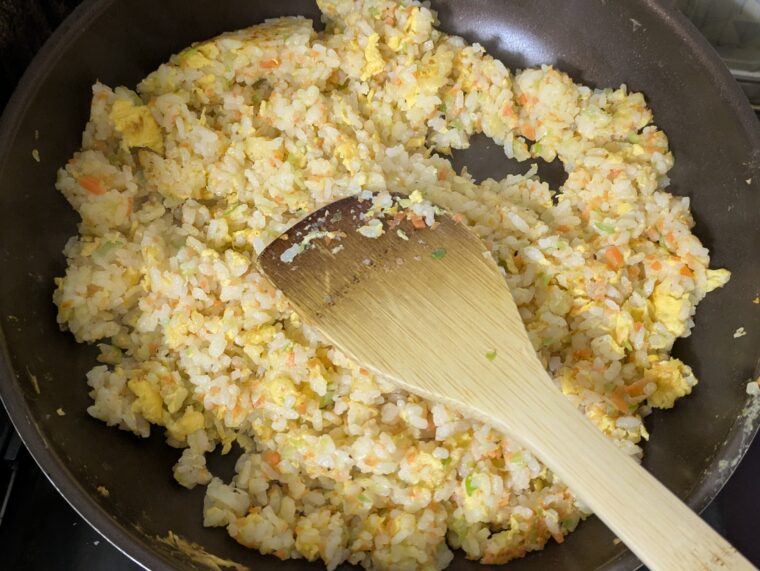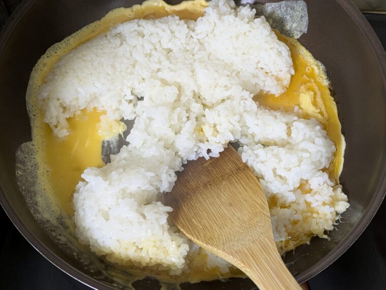 ⑩溶き卵を入れてからすぐにご飯を入れて卵と馴染ませます。