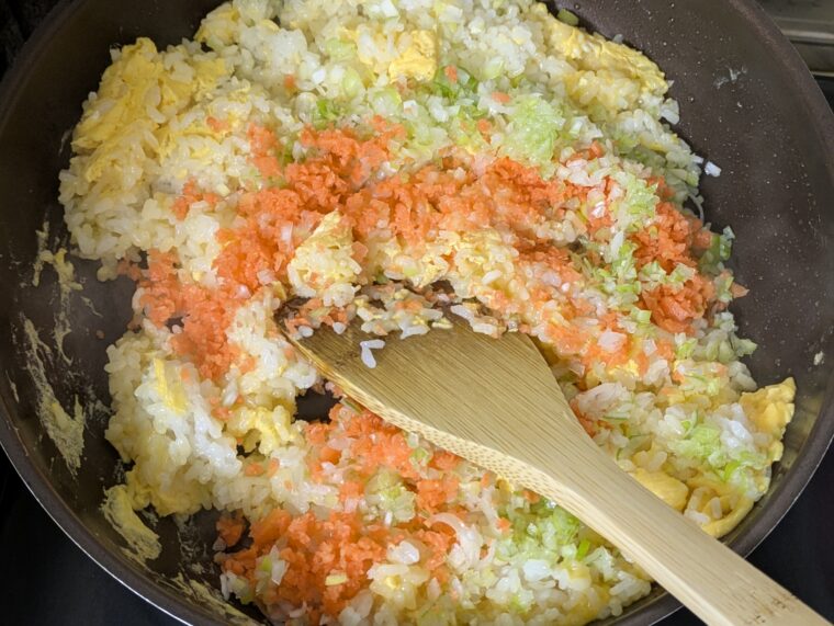 ⑪馴染んできたら白ねぎと人参と塩コショウを入れ炒め合わせます。