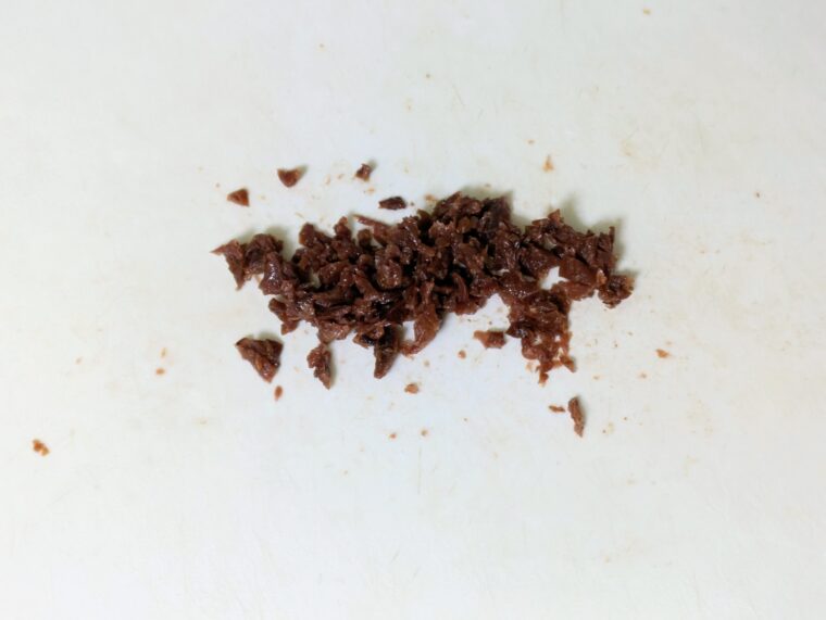 ⑥大葉は茎を切り落としてから丸めて千切りにします。