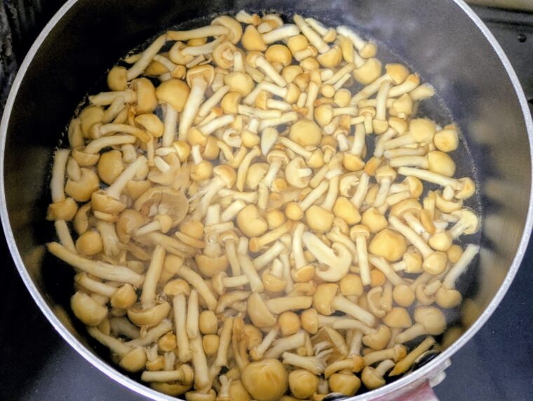 ④お湯が沸いたら洗ったなめこを入れて2分茹でます。