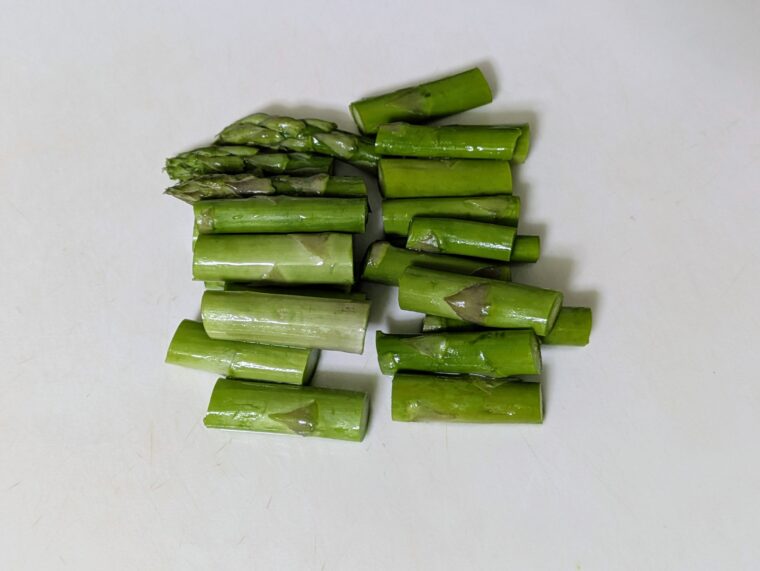 ③アスパラは固い部分を切り落として3cm幅に切ります。