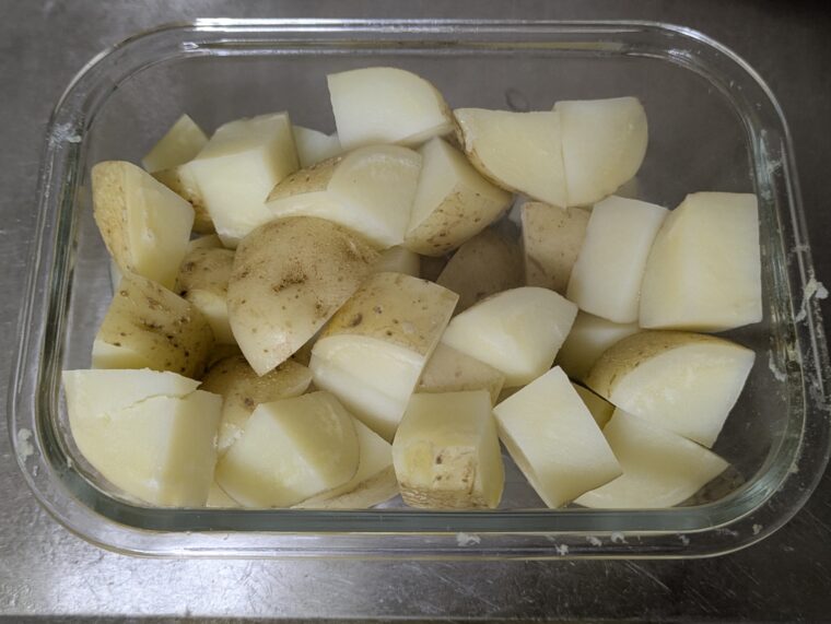 ⑤じゃが芋はレンチンが終わったら竹串を刺してみてまだ固いようでしたら1分半追加で加熱してください。