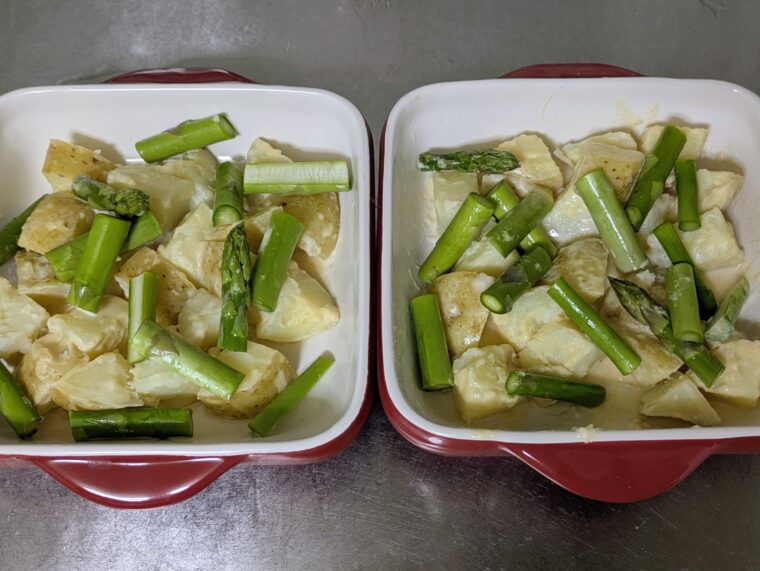 ⑦グラタン皿にじゃが芋を敷いてアスパラを上にのせます。