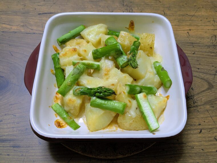 今回は春の食材新じゃがとアスパラを使った味噌マヨチーズ焼きの作り方を紹介したいと思います。