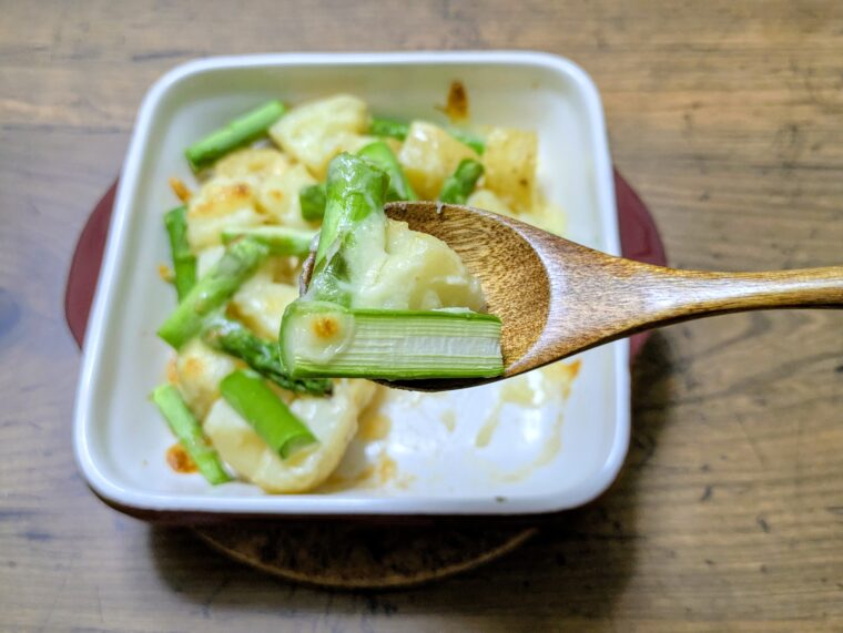 ホクホクの新じゃがとシャキシャキしたアスパラに味噌マヨチーズがよく合います。コク深い味わいで何度でも食べたくなる味です。