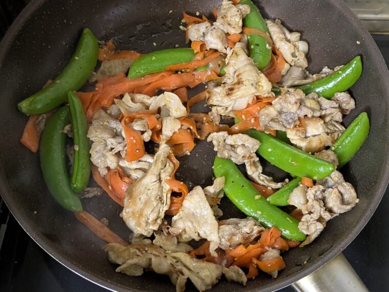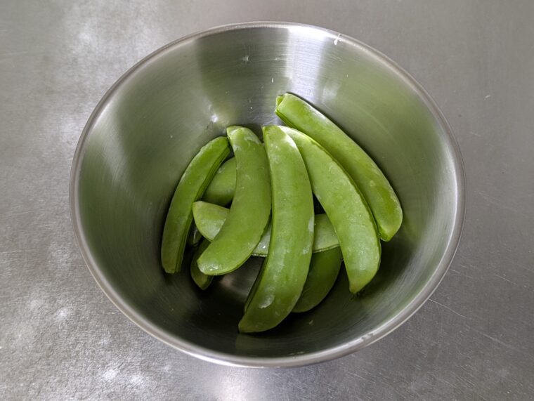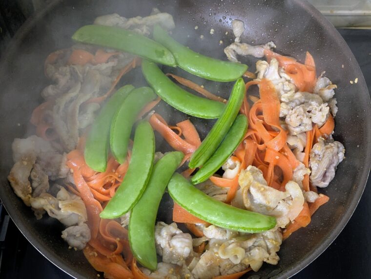 ⑤人参がしんなりしてきたらスナップエンドウを入れてスナップエンドウの色が鮮やかになるまでささっと炒めます。