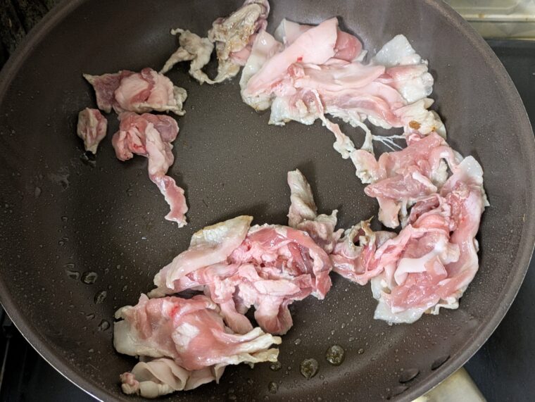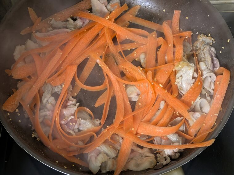 ④塩を振って肉が褐色になる一歩手前で人参とガーリックパウダーを入れて炒めます。