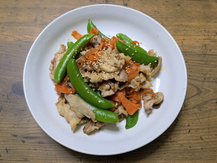【包丁まな板いらず】豚こまとスナップエンドウのガーリック炒め