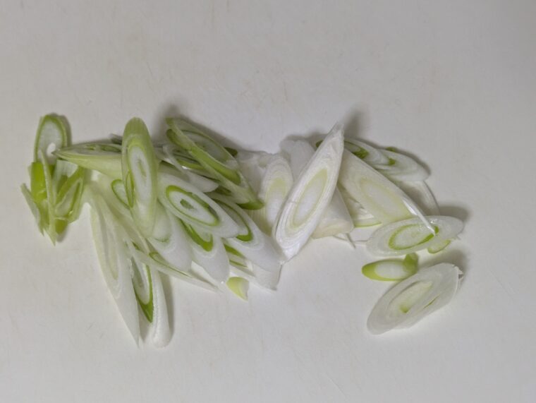②白ねぎは根と上の硬い部分を切り落としてから斜めに薄く切って水にさらして辛味を抜きます。
