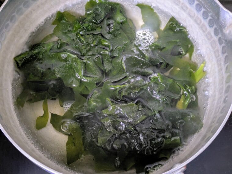 ④お湯が沸いたらわかめを入れて色が鮮やかな緑色になるまで茹でます。