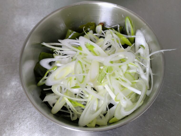 ⑦③にわかめと辛味を抜き水気を切った白ねぎを入れてよく和えます。