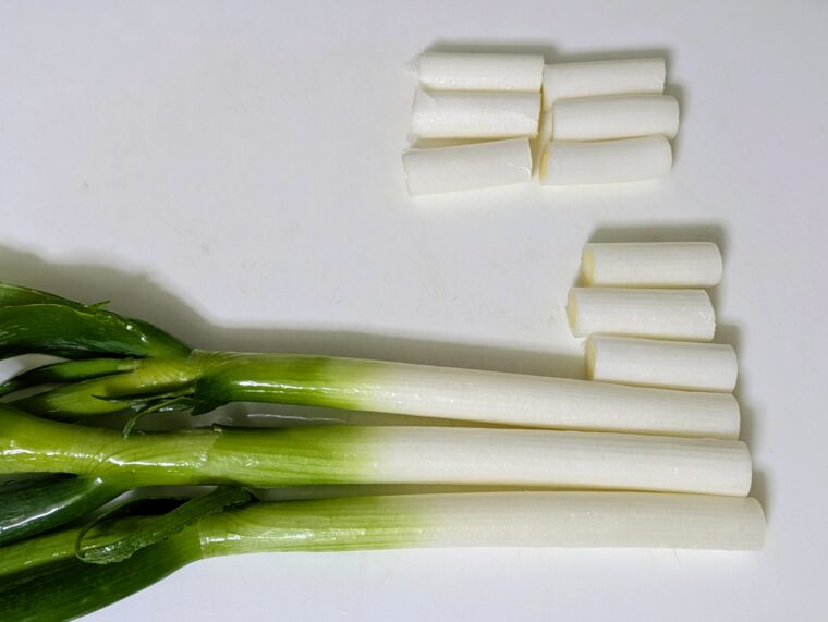 ①白ねぎは根と先端の固い部分を切り落として3.5㎝幅に揃えて切ります。
