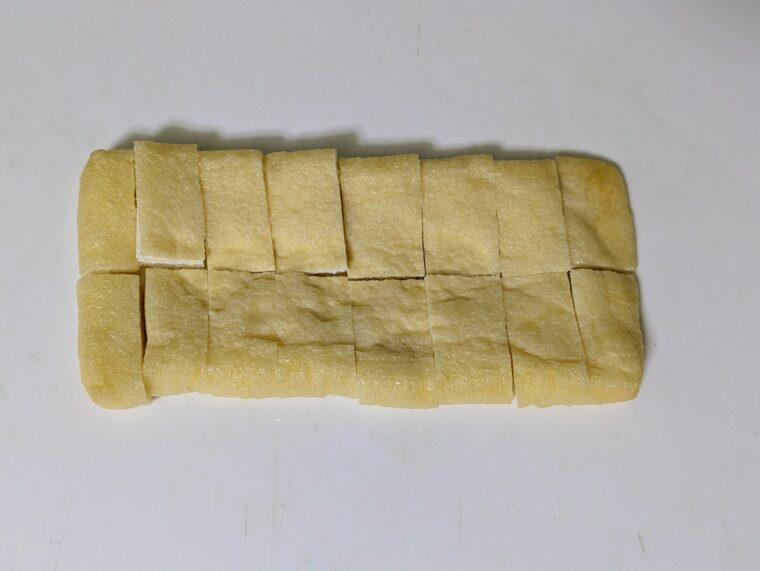 ②薄揚げは半分に切ってからねぎと同じくらいの大きさに切ります。