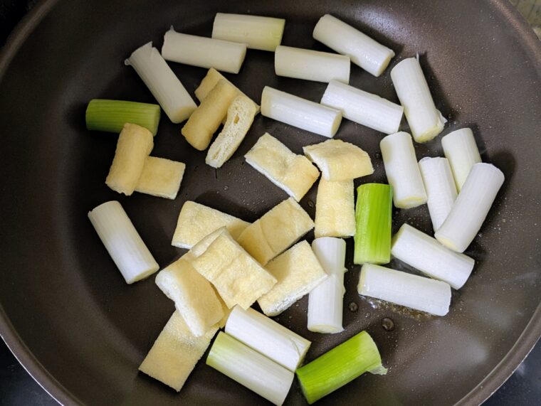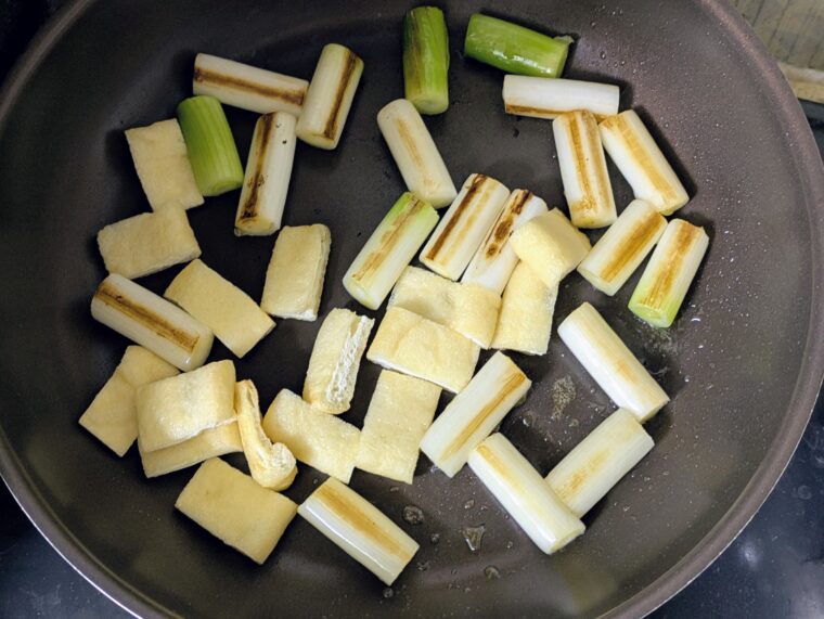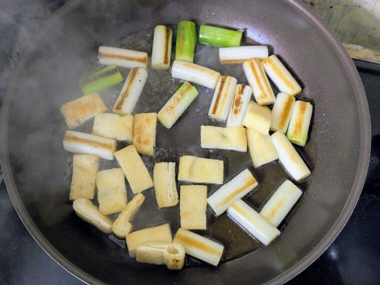 ③フライパンにごま油を引いて中火で熱し白ねぎと薄揚げを両面焼き目が付くまで焼きます。