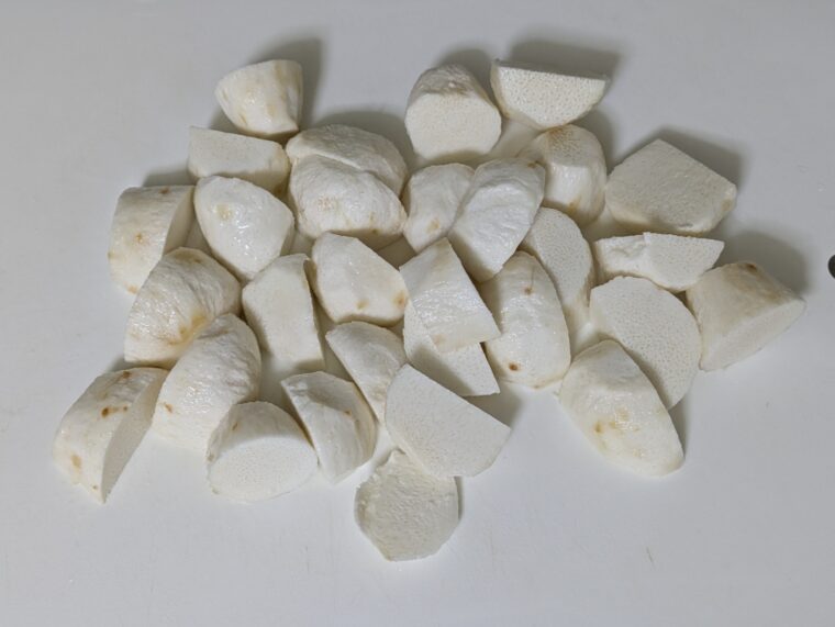 ②里芋はピーラーなどで皮をむいて4等分に切りボウルに移します。