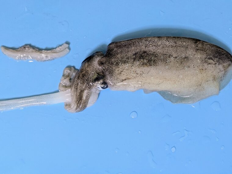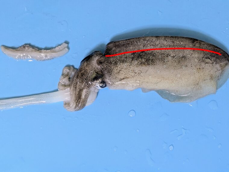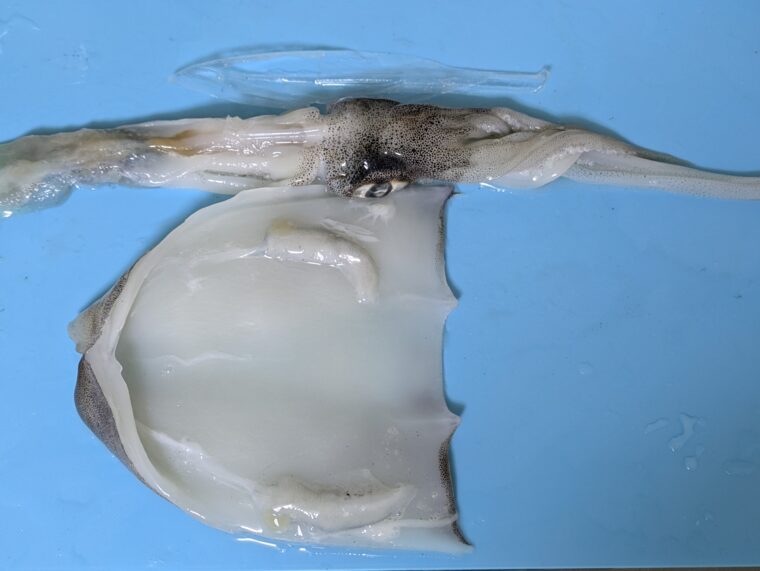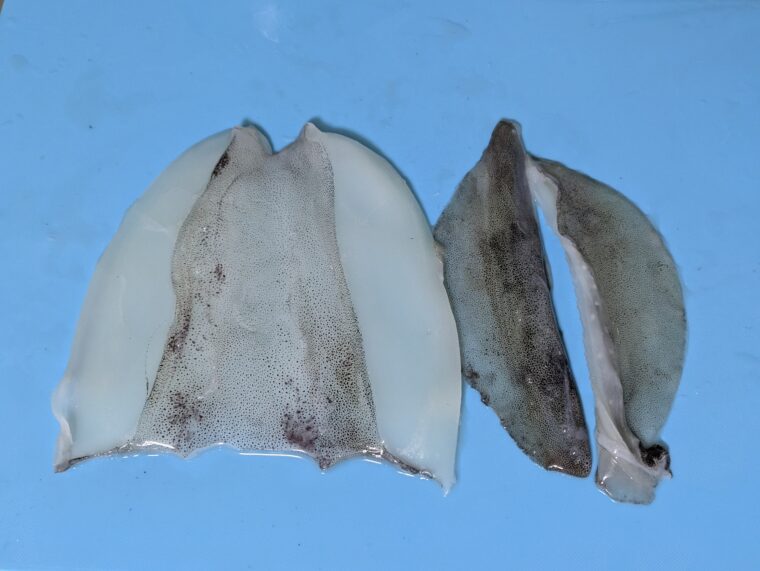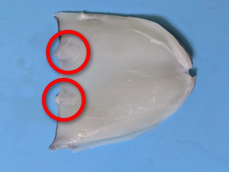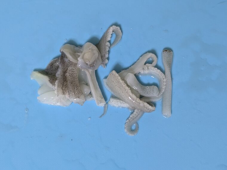 この部位は触腕と呼ばれイカが獲物を捕らえる時に使います。食べても問題ありませんが、食感が悪いので切り落とします。