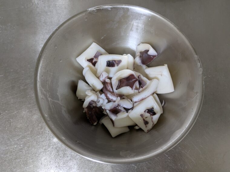 ⑨イカのヒレを剥がして胴体と一緒に食べやすい大きさに切ります。