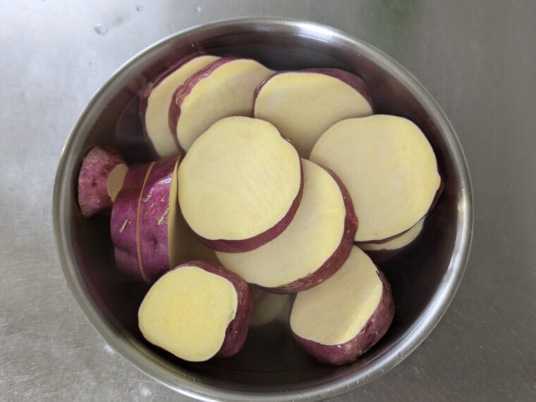 ①さつま芋は皮ごと使うので良く洗ってから5㎜幅の輪切りにします。