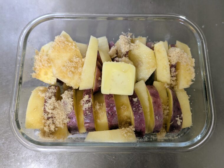⑦さつま芋の間にりんごを重ねて並べて砂糖・レモン汁・水を入れバターを載せて再びラップをして600w10分加熱します。