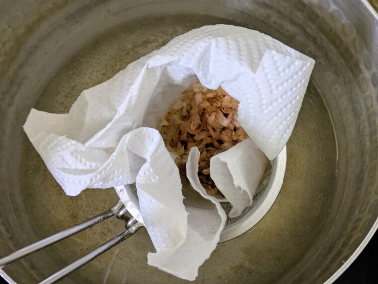 ④みそこし器にキッチンペーパーを敷いてその中にかつお節を入れて昆布だしの中に入れかつお節が沈むまで浸けておきます。