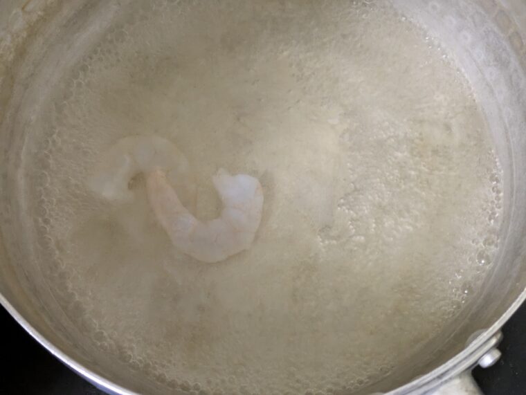 ⑧⑤の合わせだしを中火で熱し沸騰したら海老を入れて1分加熱します。最後の飾りに使うので別皿にとって置きます。