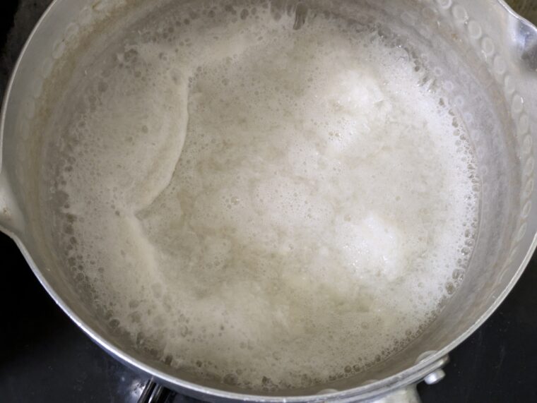 ⑨海老を取り出したらそのまま⑥のすりおろしたかぶと塩・みりんを入れて約5分加熱しのます。