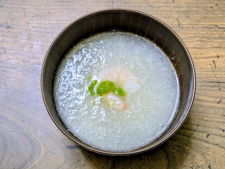 ⑫とろみがついたら火を止めて汁椀によそって茹でた海老とすりおろし器ですりおろした柑橘類の皮を飾って完成です。