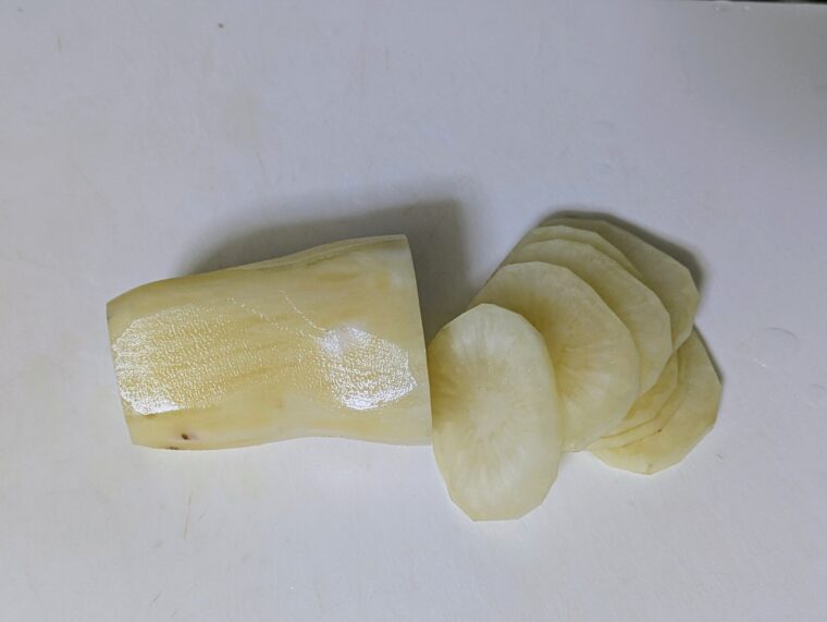 ①ヤーコンは皮をむいて包丁又はスライサーで薄くスライスします。