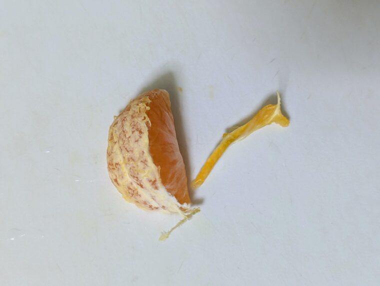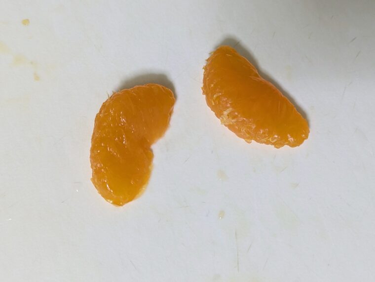 ③みかんは生なら画像のように切り目を入れて薄皮を剥きます。缶詰の場合はシロップを濾して水分を切っておきます。