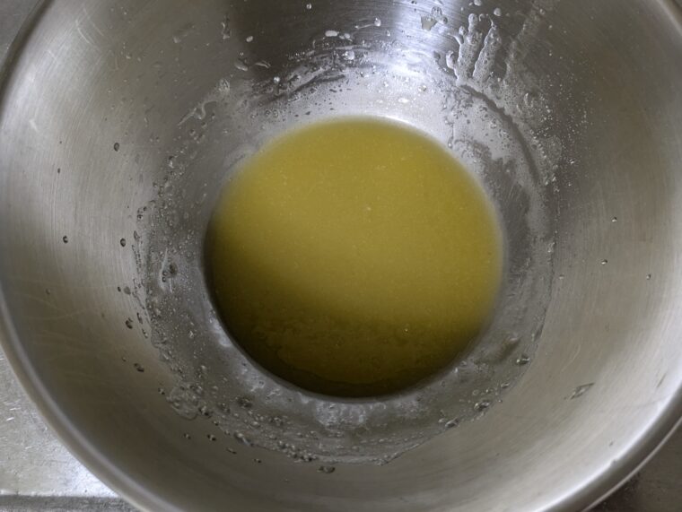 ⑥ボウルにオリーブ油と砂糖と塩を入れ混ぜてから少量ずつ酢を加えしっかり混ぜたらドレッシングの完成です。